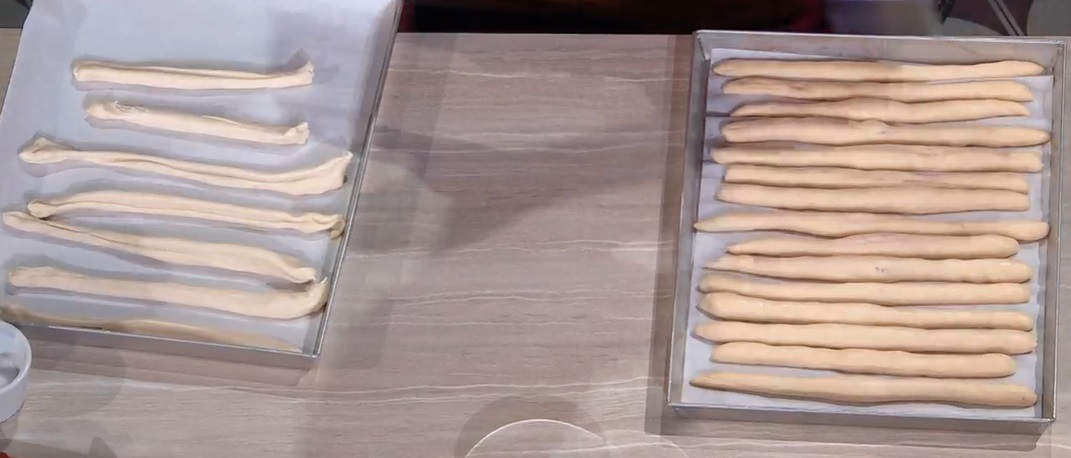 Dividiamo l’impasto in piccoli pezzi (o fettine), che allunghiamo, dando la forma di grissini. Li disponiamo su una teglia con carta forno, li copriamo e li lasciamo riposare per 1 ora a temperatura ambiente. Una volta lievitati, li trasferiamo in freezer e li facciamo congelare continuamente.