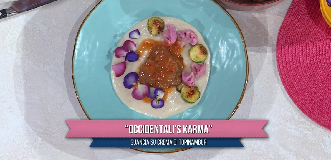guancia su crema di topinambur di Gian Piero FavaLa vicinanza all’amico Ricchebono non giova a Gian Piero Fava, sempre meno tollerante e sempre più arrogante. Il cuoco romano, oggi, prepara una ricetta ispirata a Occidentali’s Karma, ovvero la guancia su crema di topinambur.