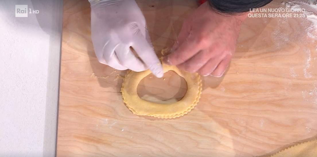 Quando l’impasto è diventato consistente, lo stendiamo, da freddo, con il mattarello, ad uno spessore di circa 1-2 cm. Con la rotella dentellata, tagliamo la sfoglia in strisce lunghe 8 cm e larghe 2 cm. Assottigliamo ogni striscia con il mattarello, quindi la ripieghiamo su se stessa, per il lungo, congiungendo le estremità dentellate (senza premere troppo). Chiudiamo la striscia ottenuta a ciambella, sigillando bene la congiuntura con un po’ d’acqua.