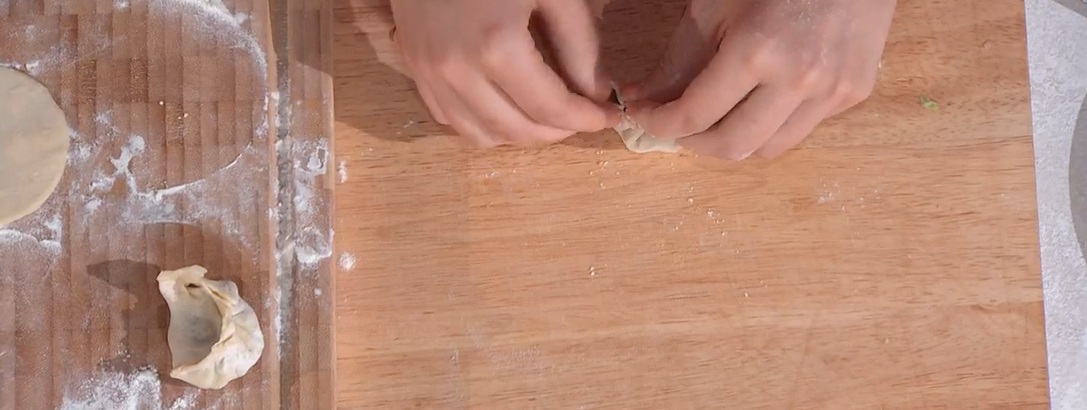 Prepariamo la pasta, lavorando le farine con l’acqua ed il sale. Avvolgiamo nella pellicola e lasciamo riposare almeno mezz’ora. Tiriamo la sfoglia sottilissima, quindi ricaviamo dei dischi e su ognuno mettiamo un cucchiaino di ripieno freddo. Chiudiamo a mezzaluna, quindi pizzichiamo il bordo come in foto.
