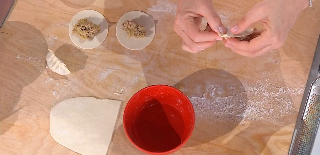 Tiriamo la sfoglia sottilissima e ritagliamo dei dischi. Su ogni disco, mettiamo un cucchiaino di ripieno, quindi richiudiamo la sfoglia sul ripieno, a mezzaluna, e pizzichiamo la ‘crestina’ con le dita.