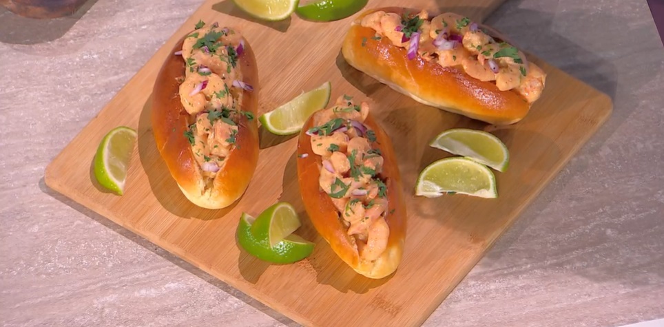 Farciamo i panini con i gamberi e la salsa, cipolla cruda affettata, coriandolo tritato e fette di lime.