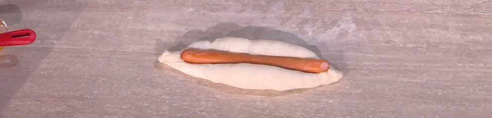 Allunghiamo ciascun pallina in modo da ottenere dei filoni allungati sulle punte ed inseriamo al centro un wurstel grande, schiacciando per bene al centro (foto). Disponiamo i panini su una teglia, li copriamo e lasciamo lievitare ancora 1 ora.