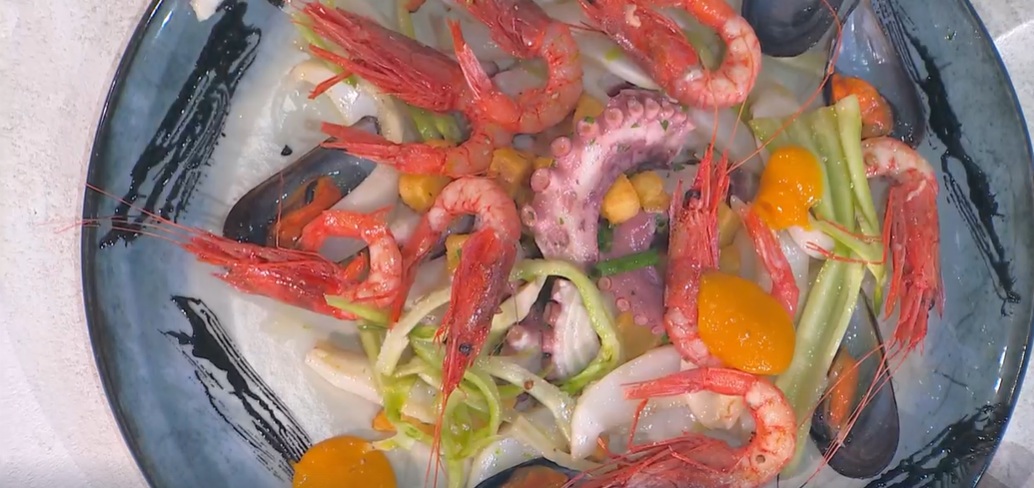Salvatore Giugliano arriva in studio con l’intento di festeggiare in cucina lo scudetto del Napoli. Il cuoco partenopeo ci regala la ricetta dell’insalata di mare a modo mio.