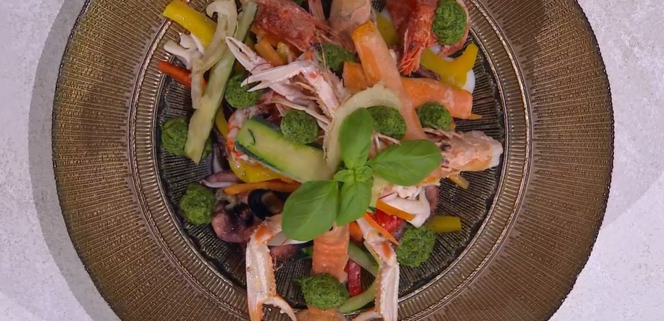 Scoliamo le verdure bollite, le mettiamo in una ciotola e le condiamo con olio e sale. Uniamo cozze e vongole sgusciate, moscardini, totani, seppie e mescoliamo il tutto. Serviamo con sopra gamberi e scampi, verdure fritte e salsa verde a fiocchi.