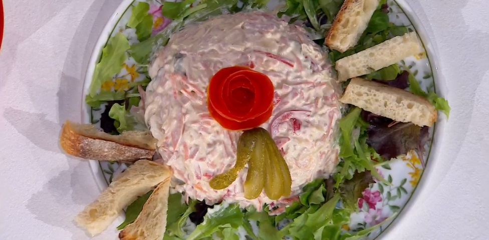Tagliamo a listarelle la mortadella e il prosciutto, li mettiamo in una ciotola ed uniamo i cetriolini sminuzzati e la maionese preparata. Incorporiamo le verdure acidulate e fredde, mescoliamo per bene e mettiamo a riposare qualche ora in frigorifero. Serviamo con insalatina e crostini di pane.