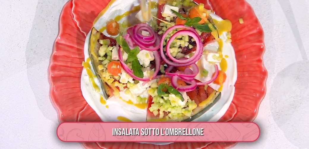 Un altro dei pilastri del mezzogiorno di Rai1 si congeda con un piatto squisitamente estivo. Arriva in cucina zia Cri, con una chioma rosso fuoco. La cuoca romagnola prepara una insalata sotto l’ombrellone.