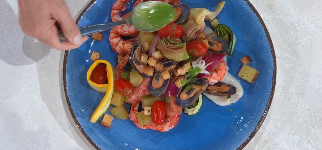 Nonostante l’abbuffata di ieri, con ben 4 Ricchebono (fratelli e madre), il cuoco ligure, Ivano Ricchebono, torna in cucina anche oggi, per proporre un secondo piatto completo, di mare. Ecco l’insalata tiepida di mare carciofini e cipolla rossa.