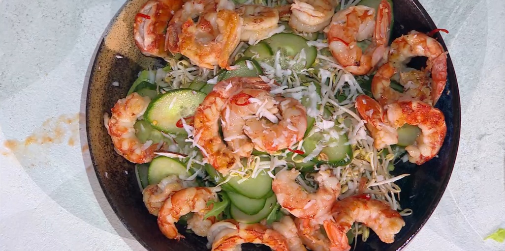 Affettiamo anche il cetriolo a rondelle sottili. Uniamo i germogli di soia e condiamo il tutto con la salsa. Uniamo quest’ultimi alla lattuga e alla rucola. Aggiungiamo i gamberoni e serviamo con degli spicchi di lime e del cocco fresco grattugiato.