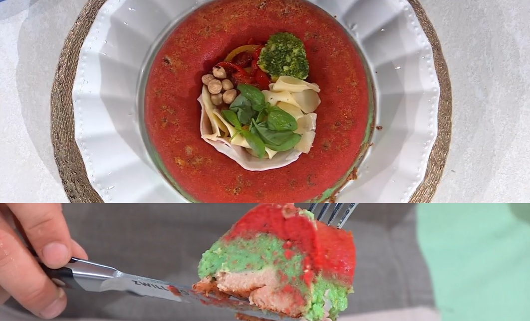 Ungiamo con l’olio uno stampo a ciambella e lo spolveriamo con abbondante pangrattato. Distribuiamo sul fondo della tortiera un po’ di nocciole, quindi formiamo sopra uno strato di purea ai peperoni. Proseguiamo con la purea ai broccoli ed adagiamo sopra il provolone e la fontina a fette ed il prosciutto affettato. Finiamo con la purea al prosciutto cotto. Livelliamo e cuociamo in forno caldo a 200° per 20 minuti.