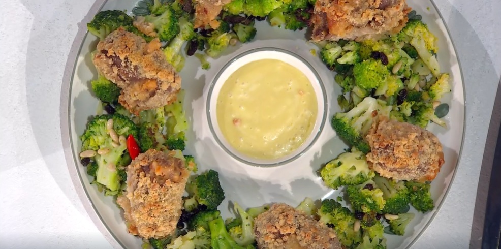 Contorno: in padella, scaldiamo olio, aglio schiacciato, filetto d’acciuga e peperoncino fresco a piacere. Uniamo i pinoli, l’uvetta e lasciamo insaporire. Uniamo le cimette di broccolo già sbollentate e lasciamo rosolare.