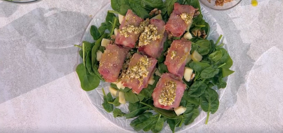 Per accompagnare, condiamo gli spinacini con olio e sale, uniamo le noci e le mele a dadini.