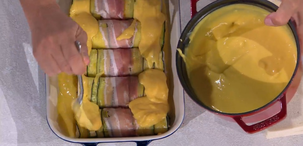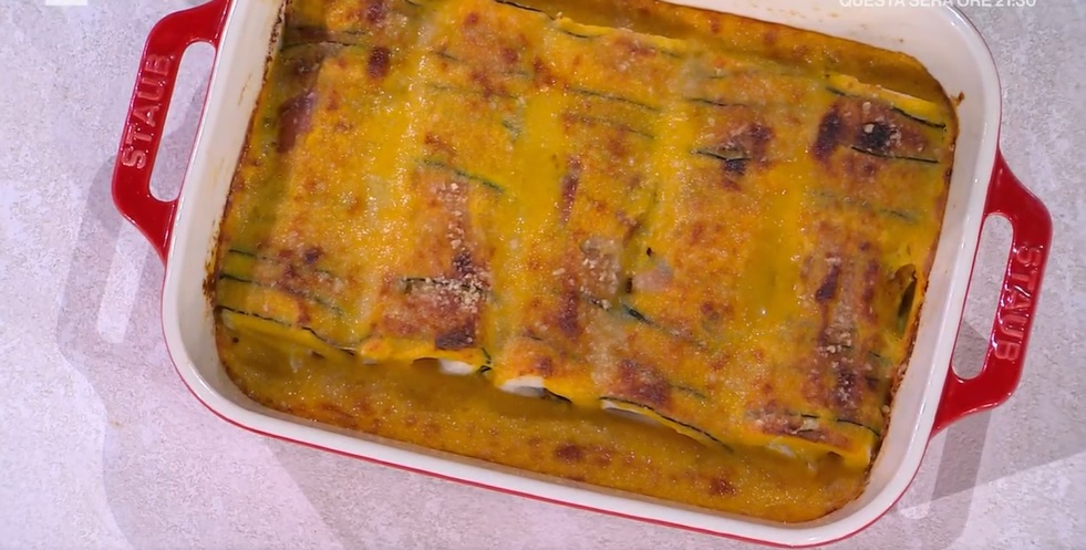 Spalmiamo un po’ di besciamella sul fondo della pirofila, adagiamo sopra gli involtini e copriamo con altra besciamella. Mettiamo in forno caldo e statico a 180° per 20 minuti.