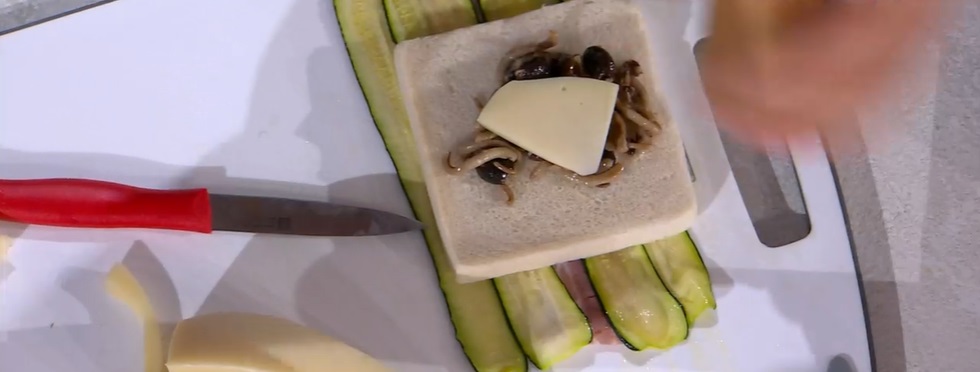 Assottigliamo il pane in cassetta con il mattarello. Disponiamo sul piano la pancetta affettata sottile, le zucchine a fettine sottili e precedentemente grigliate. Adagiamo sulle zucchine una fetta di pane in cassetta, quindi proseguiamo con funghi spadellati ed un pezzo di caciocavallo. Arrotoliamo il tutto su se stesso, aiutandoci con le zucchine e la pancetta (all’esterno dell’involtino).