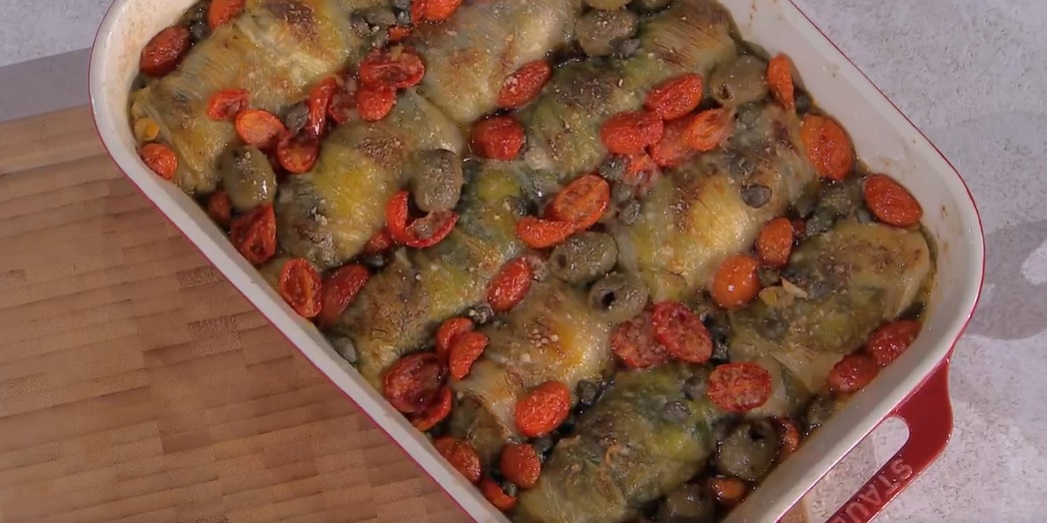 Le note di una dolce melodia anticipano l’ingresso di Antonio Paolino, che ormai se la canta e se la suona in cucina con estrema naturalezza. Il cuoco campano, oggi, propone un piatto vegetariano, che racconta la sua terra. Ecco gli involtini di scarola gratinati.