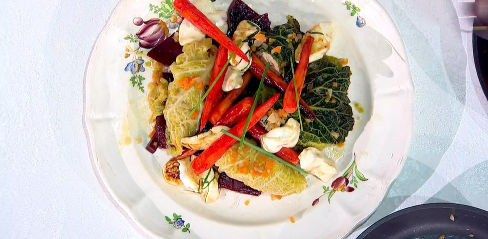 • 6 foglie di verza, 100 g macinato di vitello, 30 g formaggio grattugiato, 1 tuorlo, 80 g misto per soffritto, 2 fette di pane in cassetta, 50 ml latte, 4 rape rosse, 8 carote baby, 200 g primosale, mezzo bicchiere di aceto di mele, 1 cucchiaino di zucchero, 30 g burro, 200 ml brodo vegetale, timo, erba cipollina, olio, sale e pepe
