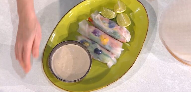Ammolliamo i fogli di carta di riso in acqua fredda, li scoliamo e mettiamo su un foglio le verdure, il pollo, semi di sesamo, foglioline di menta e coriandolo, fiori eduli. Arrotoliamo il foglio sul ripieno e l’involtino è pronto. Si serve freddo, con la salsa. Possiamo anche ripassarli in padella con dell’olio.