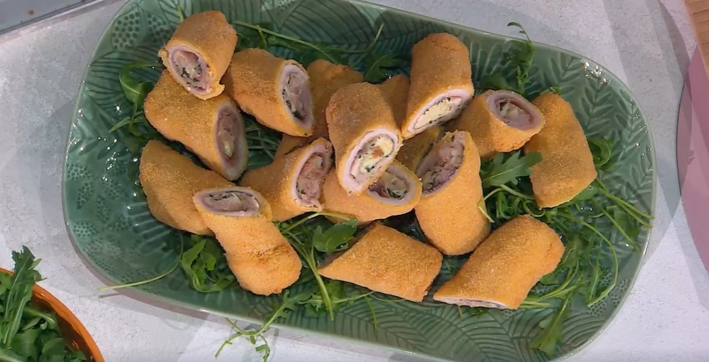 Apriamo le fette di lonza di maiale a libretto e le battiamo con il batticarne per assottigliarle leggermente. Le farciamo con scamorza a fettine, prosciutto crudo, prezzemolo tritato. Arrotoliamo la lonza sul ripieno, formando degli involtini ben stretti. Li passiamo nella farina, nelle uova sbattute e nel pangrattato. Li mettiamo a riposare per 10 minuti in frigorifero, quindi li friggiamo in due dita d’olio caldo a 180°.
