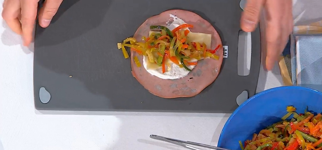 Su ogni fetta di mortadella grigliata, spalmiamo un po’ di crema di ricotta, quindi mettiamo al centro una fetta di edamer ed un po’ di verdure spadellate. Arrotoliamo la mortadella sul ripieno, formando un involtino. Avvolgiamo ogni involtino in due fogli di pasta fillo. Sigilliamo le estremità spennellando la pasta con un po’ d’acqua. friggiamo in olio caldo e profondo fino a doratura. Possiamo anche spennellarli con olio e cuocerli in forno.
