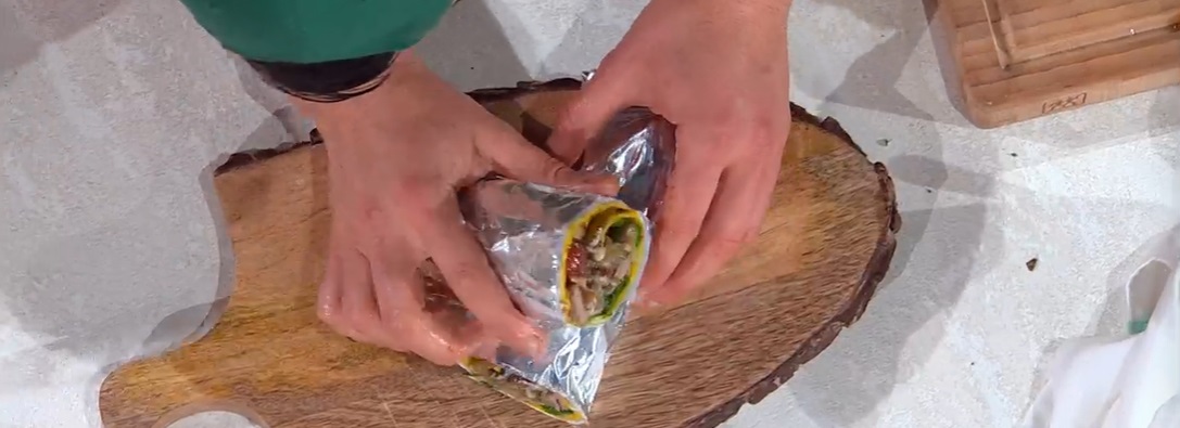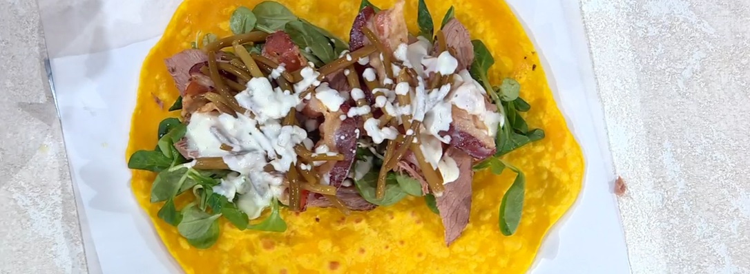 Su una piadina, distribuiamo un po’ di insalatina, il cosciotto affettato sottile, la pancetta croccante, i germogli d’aglio e la fonduta di primo sale (facciamo sciogliere il primo sale nella panna). Arrotoliamo la piadina sul ripieno.