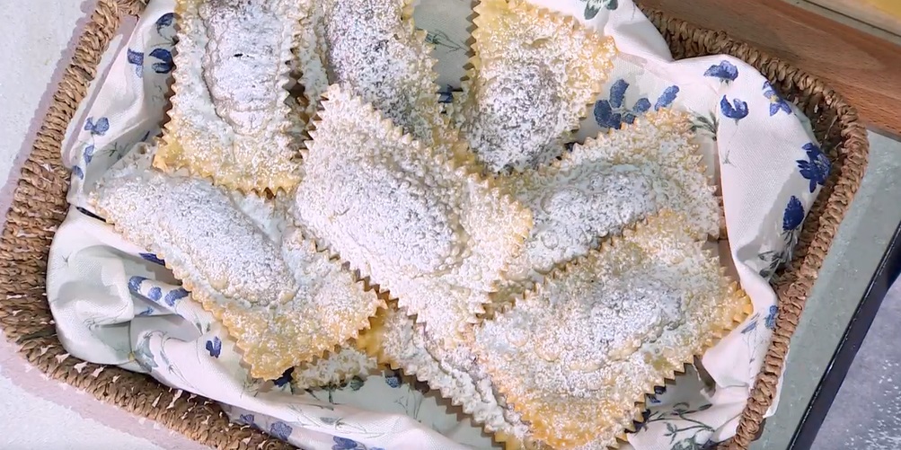 Stendiamo l’impasto riposato con il mattarello, sottile, come fosse pasta all’uovo. Distribuiamo sulla sfoglia dei mucchietti di ripieno, quindi la ripieghiamo sul ripieno e ritagliamo come dei ravioli rettangolari; lasciamo riposare in frigorifero, coperti, per una mezz’ora. Li friggiamo in olio caldo e profondo fino a doratura. Li scoliamo su carta assorbente e li spolveriamo con zucchero a velo.