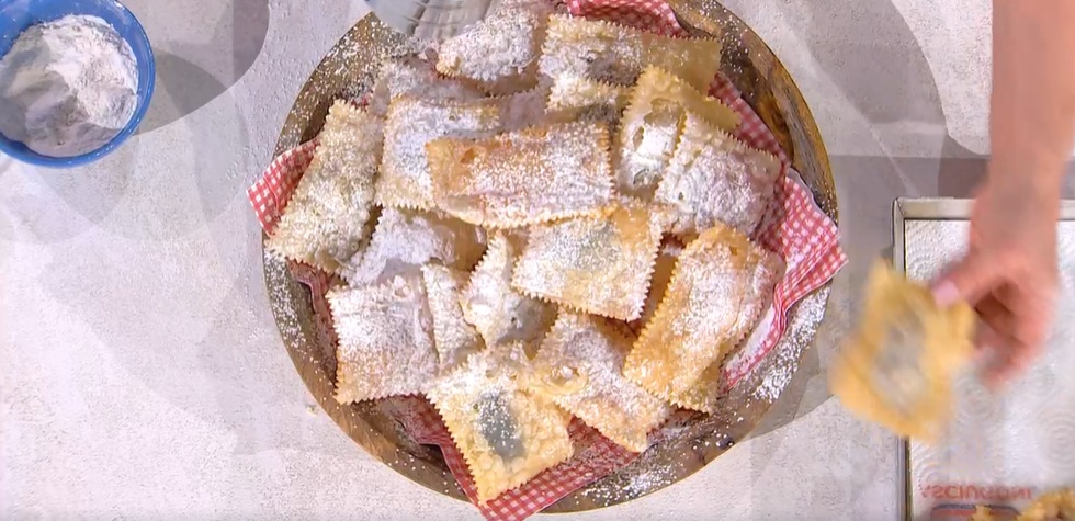 Friggiamo i ravioli in olio caldo e profondo fino a doratura: si formeranno delle bolle. Scoliamo su carta assorbente e serviamo con zucchero a velo.