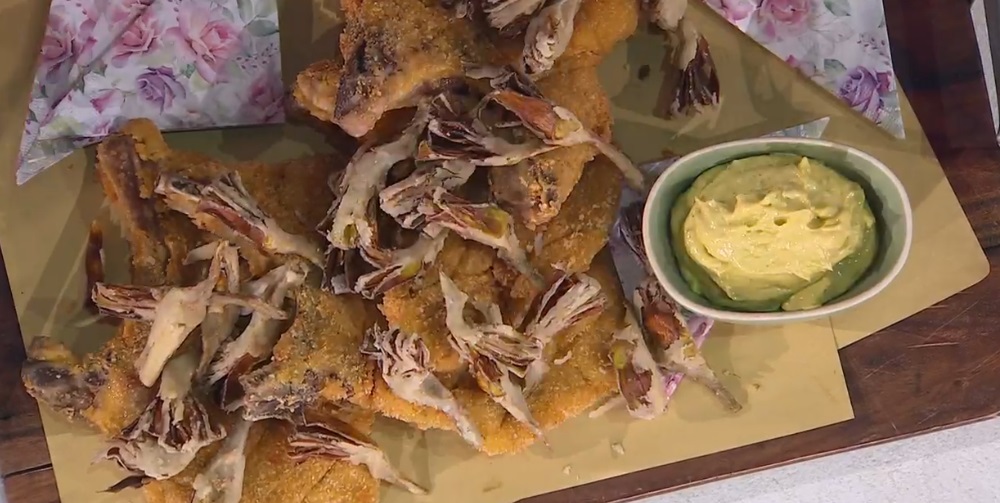 Per i carciofi, li puliamo, li tagliamo a spicchi e li mettiamo in una ciotola. Li irroriamo con il vino bianco e li lasciamo marinare per 10 minuti. Li scoliamo e li passiamo nella farina di riso, quindi li friggiamo in olio caldo e profondo.