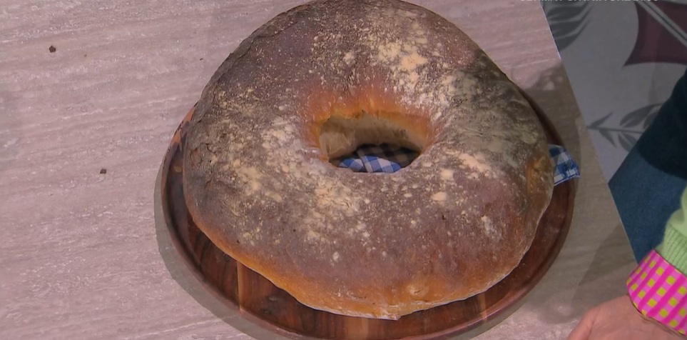 Dopo la prima ora, trasferiamo l’impasto sul piano infarinato, lo schiacciamo leggermente, in modo da allargarlo, e formiamo un foro al centro. Lo trasferiamo sulla teglia con carta forno, copriamo e lasciamo lievitare ancora 1 ora. Cuociamo in forno caldo e statico a 250° per 30 minuti.