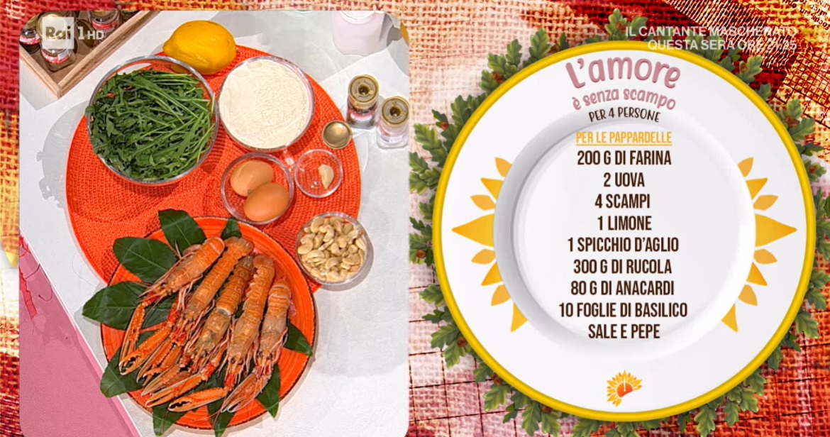 - Pappardelle: 200 g farina, 2 uova, 4 scampi, 1 limone, 1 spicchio d’aglio, 300 g rucola, 80 g anacardi, 10 foglie di basilico, sale e pepe