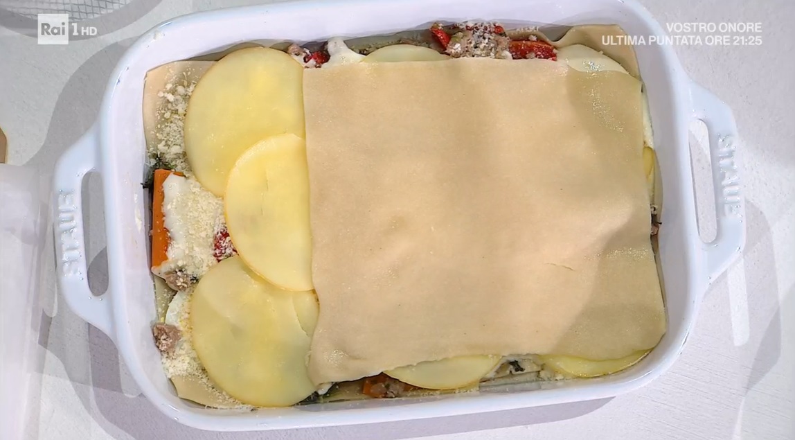 Componiamo: alla base della pirofila, spalmiamo un po’ di fonduta e distribuiamo un po’ di condimento (salsiccia, cime di rapa e peperoni), copriamo con uno strato di lasagne, quindi proseguiamo con le uova sode a fette, un po’ di condimento (salsiccia), fonduta, parmigiano grattugiato, provola affumicata a fette e ripetiamo gli strati: pasta, condimento, fonduta, parmigiano, uova e provola. Finiamo con pasta, condimento, fonduta, uova e parmigiano grattugiato. Cuociamo in forno caldo e statico a 180° per 40 minuti. Serviamo con sopra la pancetta croccante sbriciolata.