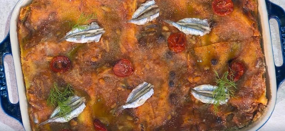 Componiamo: all’interno della pirofila, spalmiamo un po’ di sugo sul fondo. Disponiamo sopra le lasagne e copriamo con altro sugo, quindi disponiamo sopra qualche filetto di sarda fresca (cruda), ancora lasagne, sugo e sarde. Proseguiamo in questo modo, fino a creare almeno 5 strati di pasta. Finiamo con il sugo ed abbondante pangrattato. Cuociamo in forno caldo a 180° per 20 minuti.