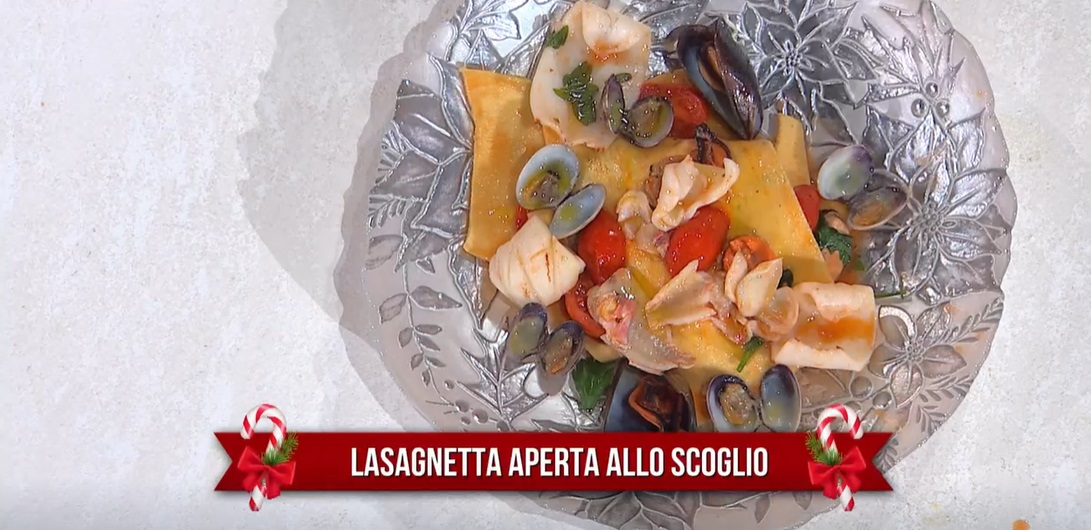 Prepariamo le sfoglie della lasagna o usiamo quelle già pronte, Le cuociamo in acqua bollente, le scoliamo e le saltiamo in padella con il sughetto. Serviamo sovrapponendole sul piatto, insieme al condimento ed i pesci.