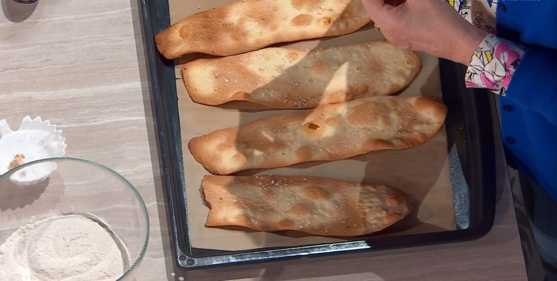 Con il mattarello o la macchinetta sfogliatrice per la pasta all’uovo, stendiamo ciascuna lingua, sottile. Le disponiamo sulla teglia con carta forno, spennelliamo con olio e spolveriamo con sale grosso. Lasciamo riposare ancora mezz’ora e cuociamo in forno caldo e statico a 200° per 12 minuti.