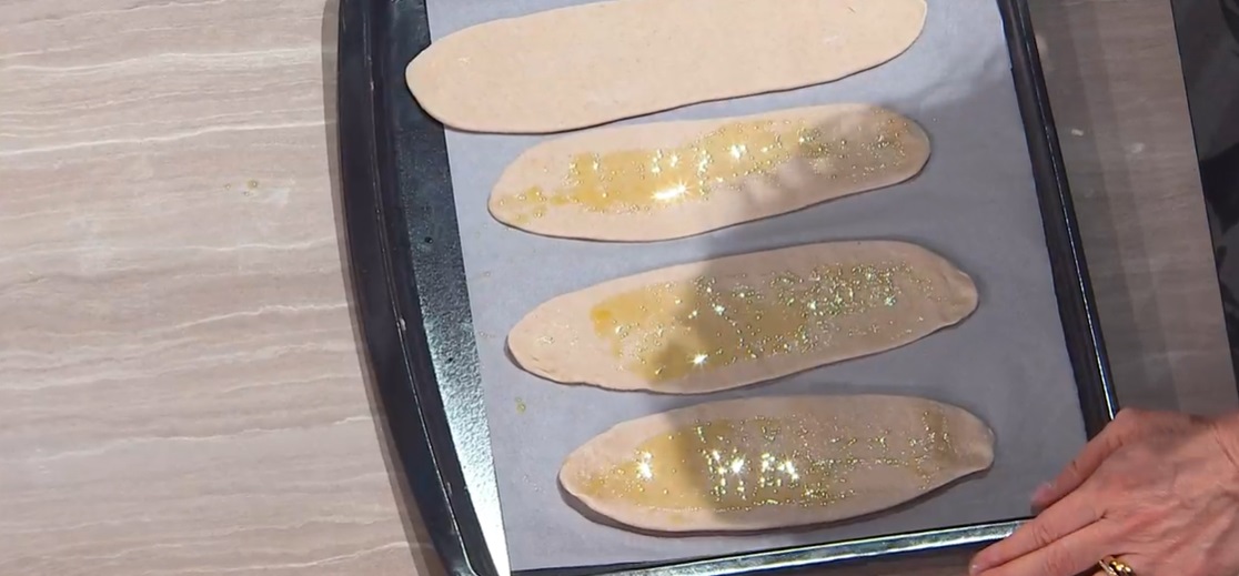 Dividiamo in palline da 40 g, che ripieghiamo su loro stesse, dando la forma allungata. Le disponiamo su una teglia con carta forno, copriamo e lasciamo lievitare ancora mezz’ora.