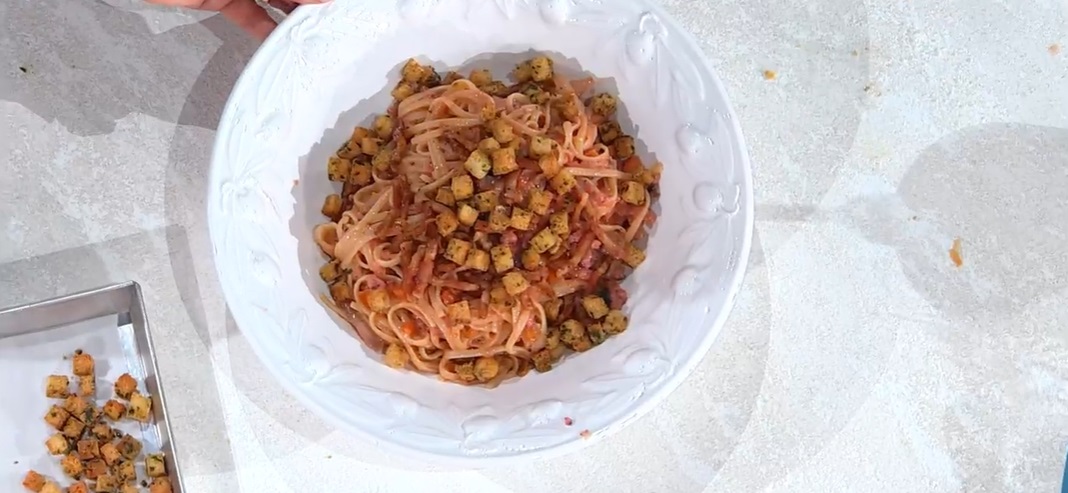 In un’altra padella, facciamo rosolare il guanciale a listarelle, senza aggiungere altro. Quando il guanciale è dorato e croccante, uniamo il ragù di polpo e la pasta scolata al dente. Mantechiamo con il pecorino grattugiato.