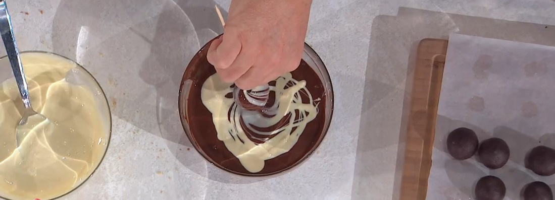 In una ciotola, mettiamo il cioccolato fondente fuso. Con un cucchiaio, coliamo sul cioccolato fuso del cioccolato bianco fuso, senza mescolare. Infilziamo le palline di impasto con uno stecco da spiedino, quindi li immergiamo nel cioccolato variegato, roteando leggermente quando li tiriamo su. Li passiamo, a piacere, nella granella di frutta secca o nel lampone disidratato. Lasciamo indurire infilzandoli su un pezzo di polistirolo o una spugna da fiorista.