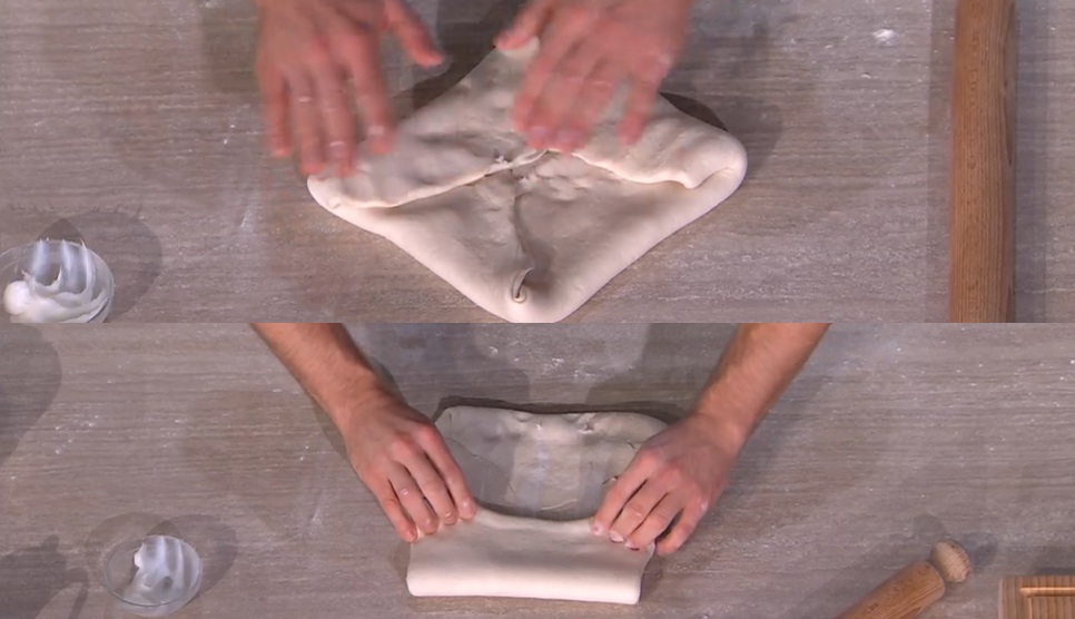 Con il mattarello, stendiamo l’impasto sottilmente, dando la forma di un rettangolo. Con le mani, spalmiamo sopra dello strutto. Ripieghiamo i lembi esterni verso il centro, quindi assottigliamo nuovamente con il mattarello. Spalmiamo sopra ancora dello strutto e diamo una piega a tre (foto). Copriamo e lasciamo riposare per 30 minuti a temperatura ambiente (o frigorifero se l’impasto è appiccicoso).