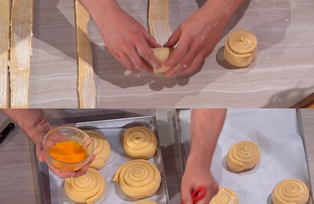 Stendiamo l’impasto con il mattarello, in modo da ottenere un rettangolo spesso circa mezzo cm. Tagliamo quest’ultimo in strisce spesse circa 5 cm, per il lungo. Le spennelliamo con il burro a pomata. Arrotoliamo ogni striscia su se stessa, a formare una chiocciola. Le disponiamo su una teglia, schiacciandole leggermente con la mano. Copriamo e lasciamo lievitare fino al raddoppio del volume, a temperatura ambiente.