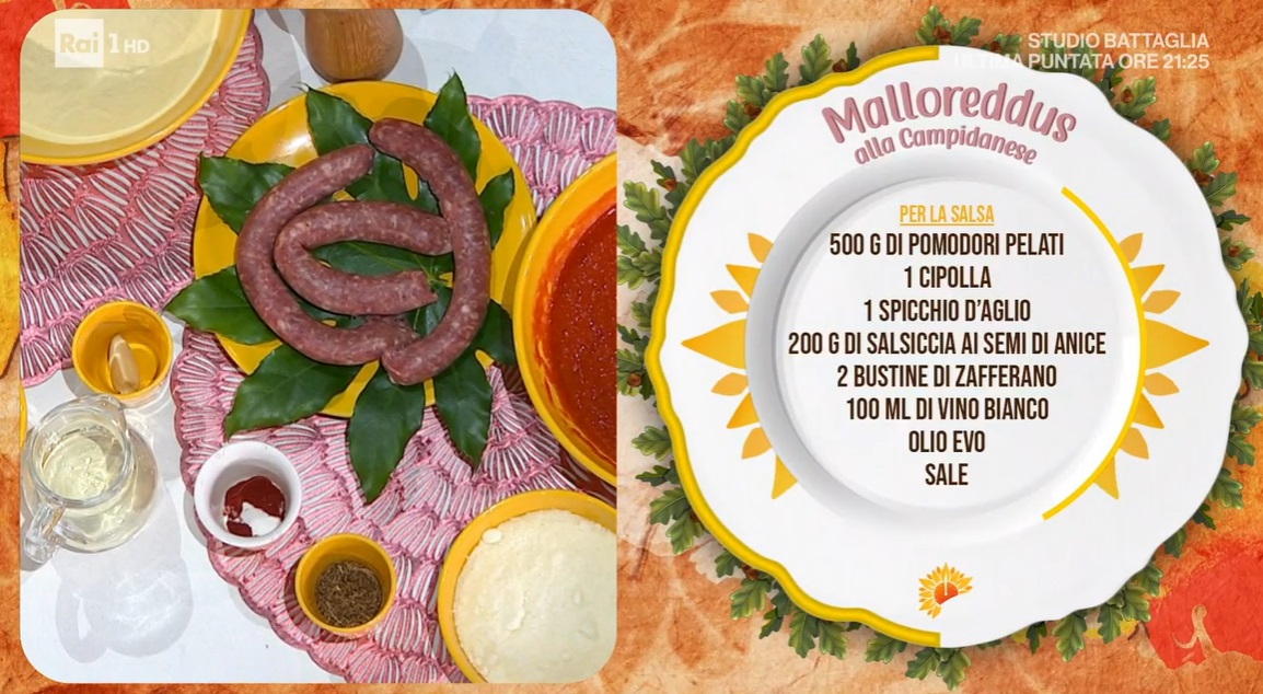 - 500 g pomodori pelati, 1 cipolla, 1 spicchio d’aglio, 200 g salsiccia ai semi di anice, 2 bustine di zafferano, 100 ml vino bianco, olio evo, sale