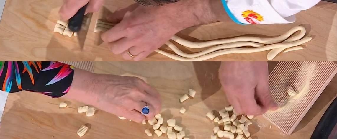 Prepariamo la pasta: scaldiamo leggermente acqua e sale. In una ciotola, o in planetaria, mettiamo la semola di grano duro e versiamo l’acqua tiepida e salata a filo, impastando pian piano fino ad ottenere un panetto omogeneo e compatto. Lo avvolgiamo nella pellicola e lasciamo riposare per almeno mezz’ora. Tagliamo il panetto a strisce, che poi allunghiamo sul piano, formando dei serpentelli sottili circa mezzo cm. Tagliamo quest’ultimi a tocchetti, quindi pressiamo ogni tocchettino sul riga-gnocchi, formando come dei piccoli gnocchettini. Li lessiamo per 5-6 minuti in acqua bollente o salata.