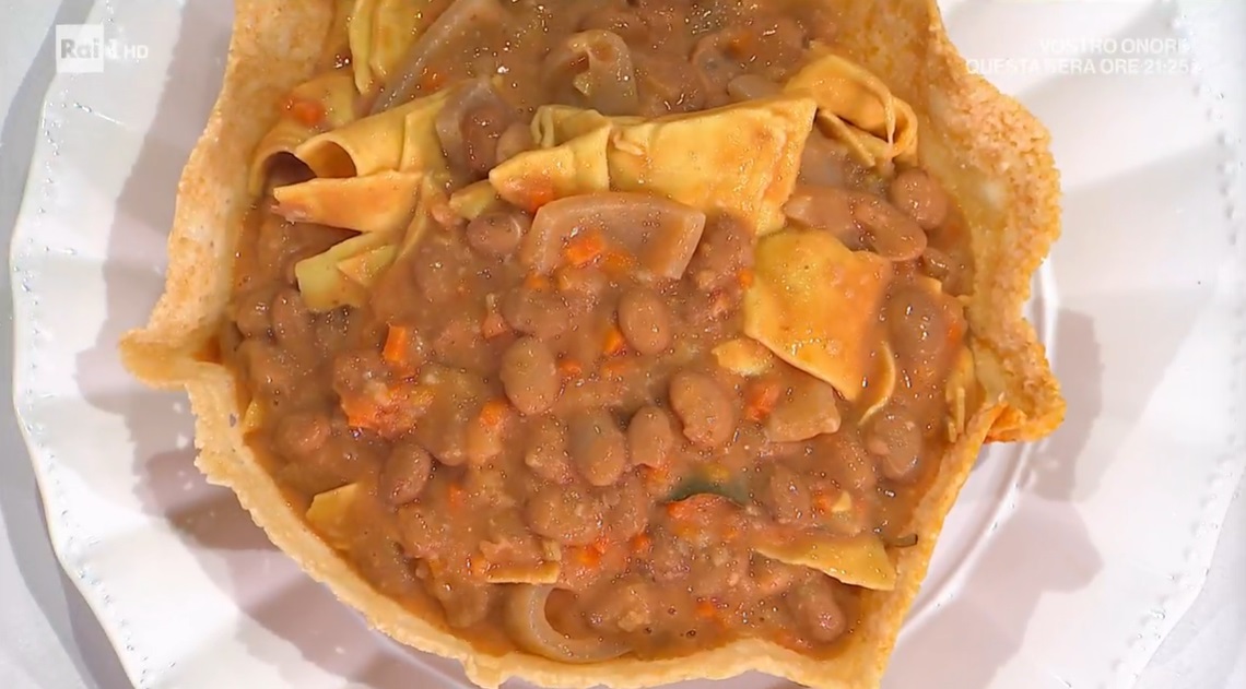 Lessiamo i maltagliati, li scoliamo e li saltiamo con il sugo di fagioli. Serviamo all’interno della cialda.