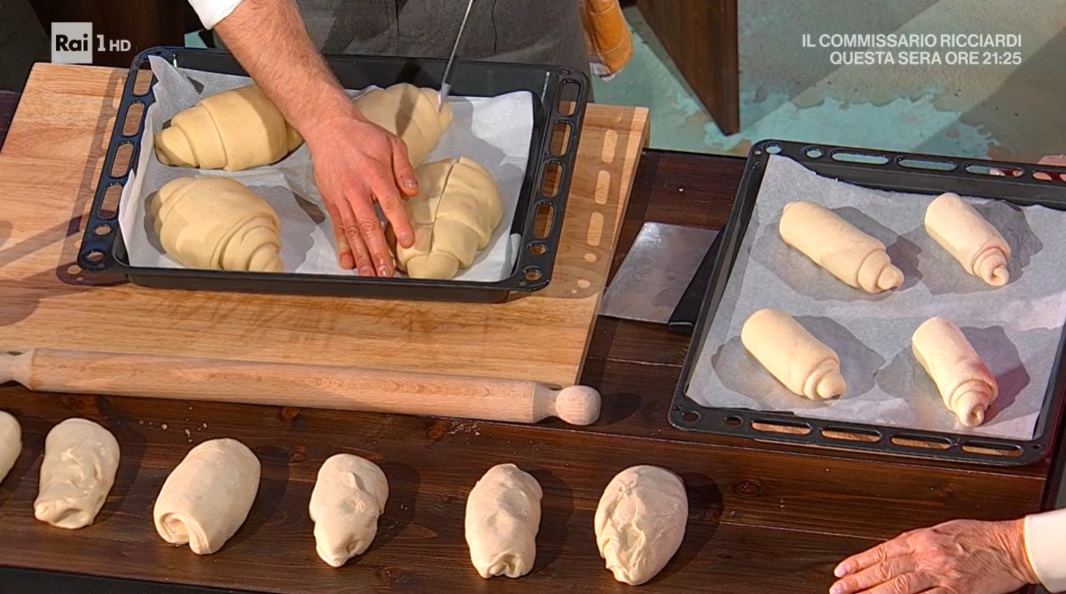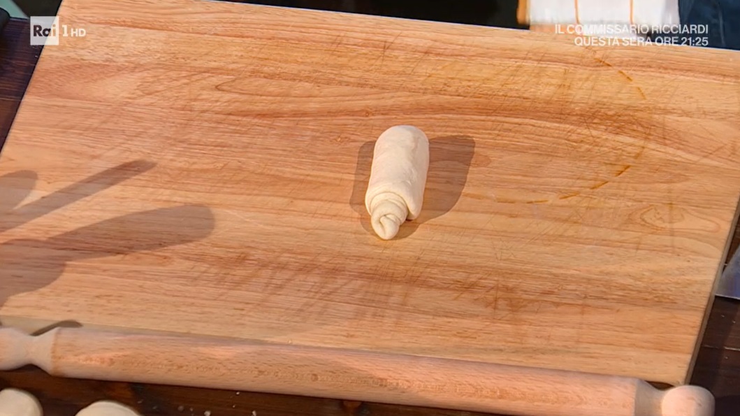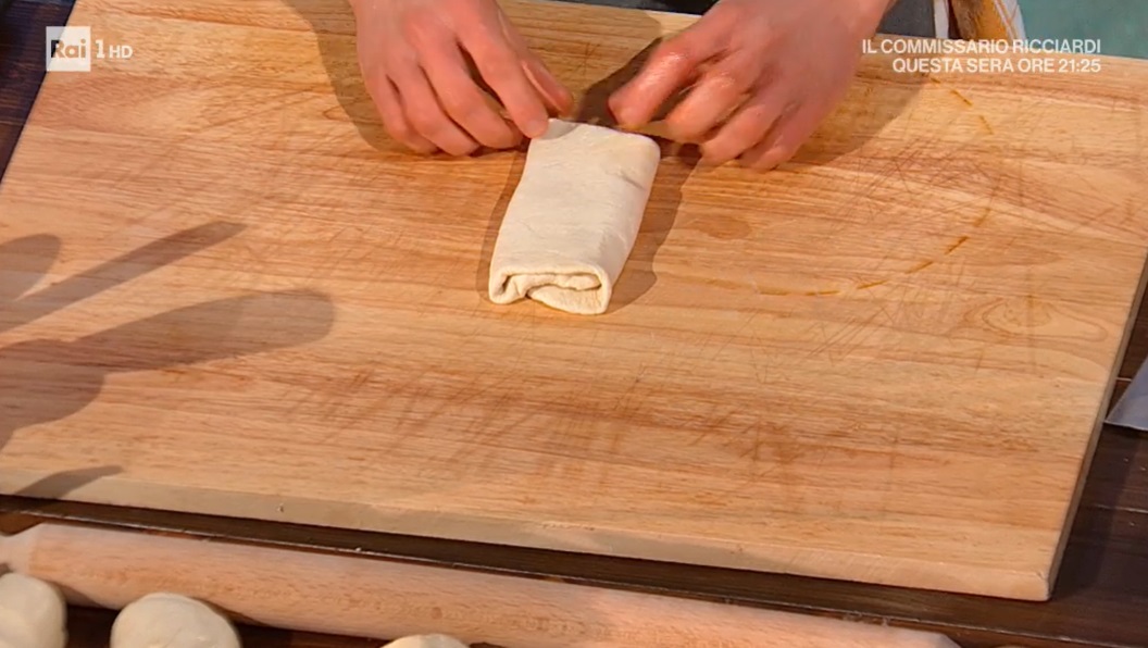 Su un banco NON infarinato, mettiamo la pagnotta lievitata, la stendiamo con il mattarello, in modo da ottenere una lingua. Pieghiamo quest’ultima a 3, quindi la stendiamo ancora con il mattarello. Arrotoliamo la lingua ottenuta su se stessa, ben stretta, in modo da ottenere una chiocciola. Disponiamo su una teglia, copriamo e lasciamo lievitare ancora 2 ore.