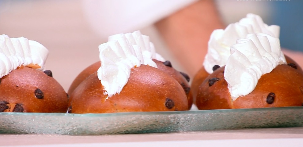 Una volta freddi, pratichiamo un’incisione per il lungo, senza dividere le due metà del panino. Farciamo il taglio con confettura di lamponi e panna montata.