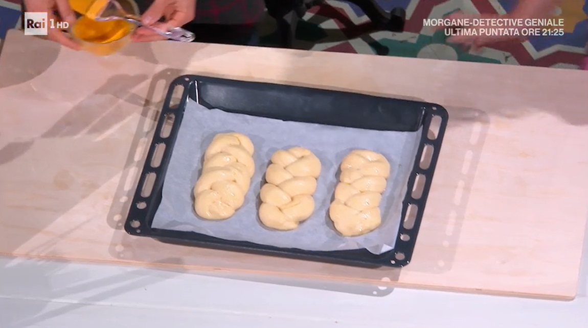 Spennelliamo con l’uovo sbattuto e spolveriamo con abbondante zucchero semolato. Cuociamo in forno caldo e statico a 200° per 15 minuti.