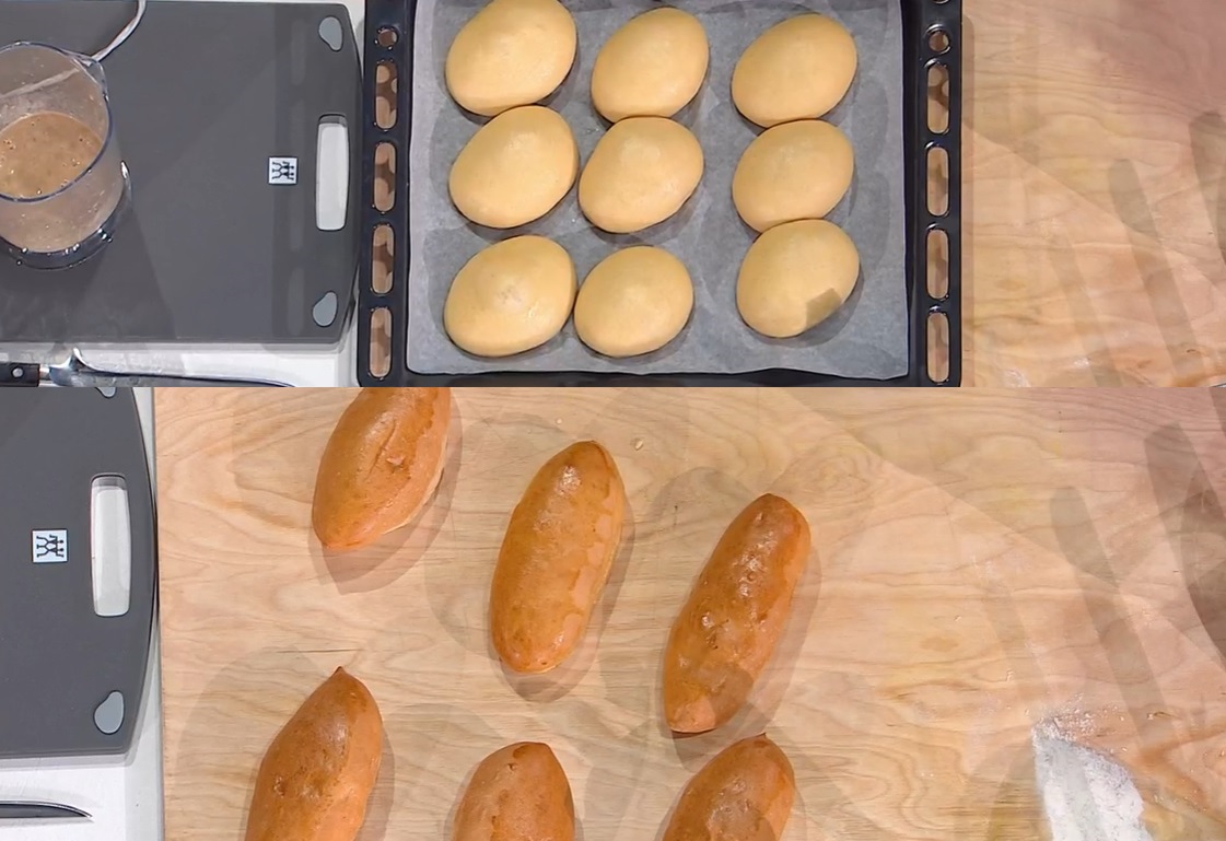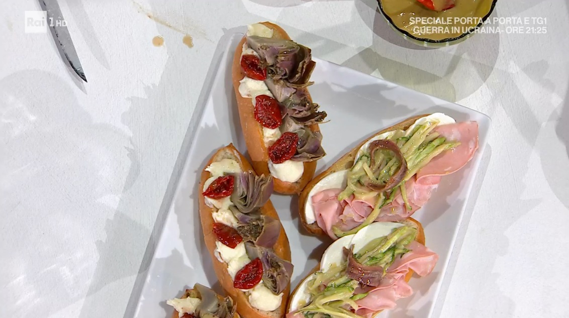 Farciamo ora i maritozzi, alcuni li spennelliamo con il dressing, poi mettiamo fettine di mozzarella di bufala, fette di mortadella, puntarelle e un’acciuga. Altri, invece, li spennelliamo con il sugo di cottura dei carciofi, poi mousse di baccalà, carciofi a pezzetti e completiamo con i pomodorini secchi.