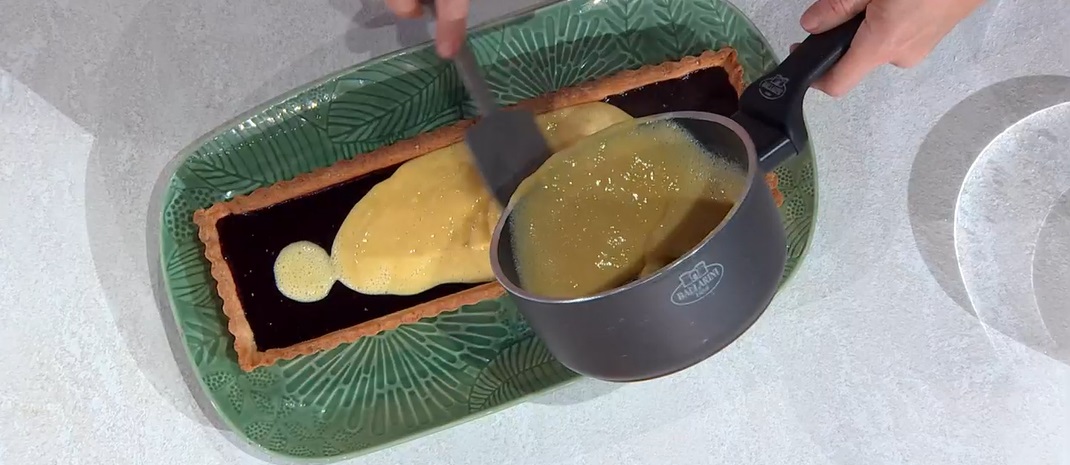 - Crema: 2 tuorli, 80 g zucchero, 20 g amido di mais, 250 g latte, vaniglia, 4 g gelatina in fogli