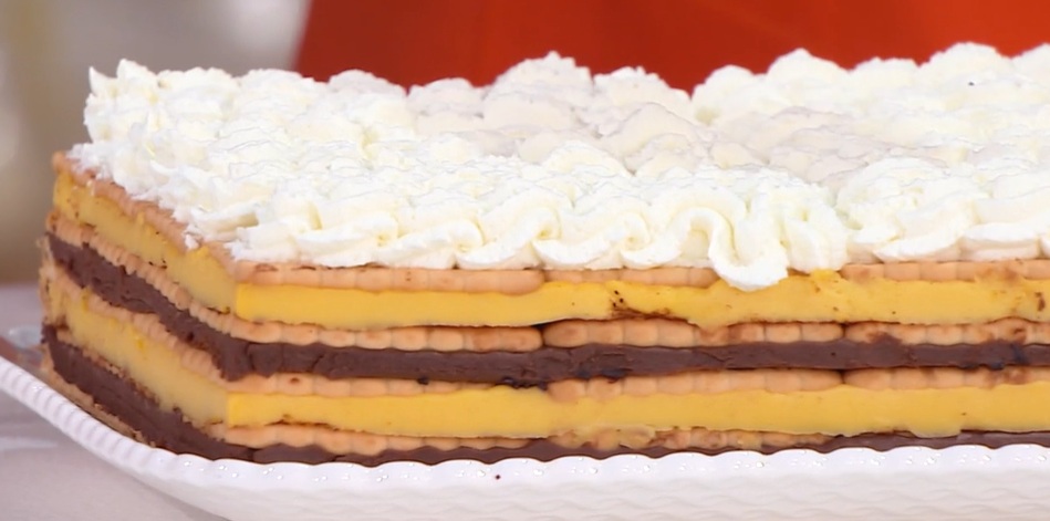 Componiamo: all’interno di una tortiera o anello rettangolare, creiamo un primo strato di biscotti secchi inzuppati nel latte tiepido. Creiamo sopra un primo strato di crema al cioccolato e di codette al cioccolato (o cioccolato tritato). Copriamo con uno strato di biscotti bagnati e un secondo strato di crema gialla con una spolverata di cacao amaro.