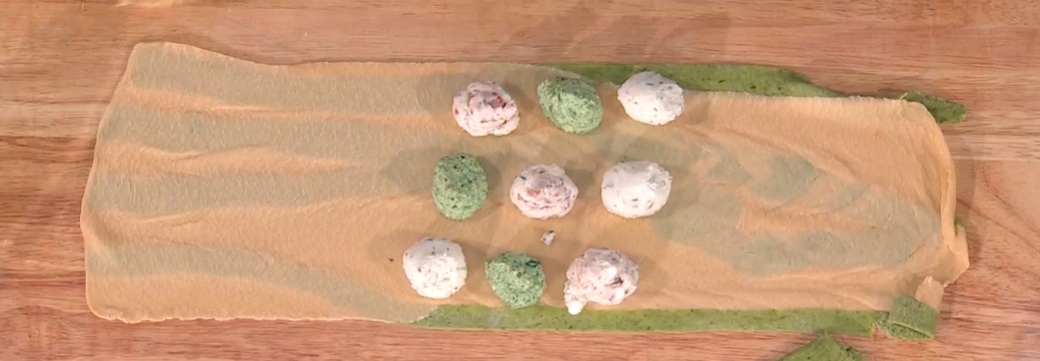 Sulla sfoglia, adagiamo sopra 9 ciuffi di ripieno, alternandoli. Ripieghiamo un’altra sfoglia sul ripieno e la facciamo ben aderire, facendo uscire tutta l’aria. Ritagliamo la nostra mattonella con 9 ripieni: un quadratone. La cuociamo in una padella colma d’acqua bollente e salata per pochi minuti: usate tanta delicatezza. Scoliamo e serviamo su un letto di salsa, con formaggio grattugiato e basilico.
