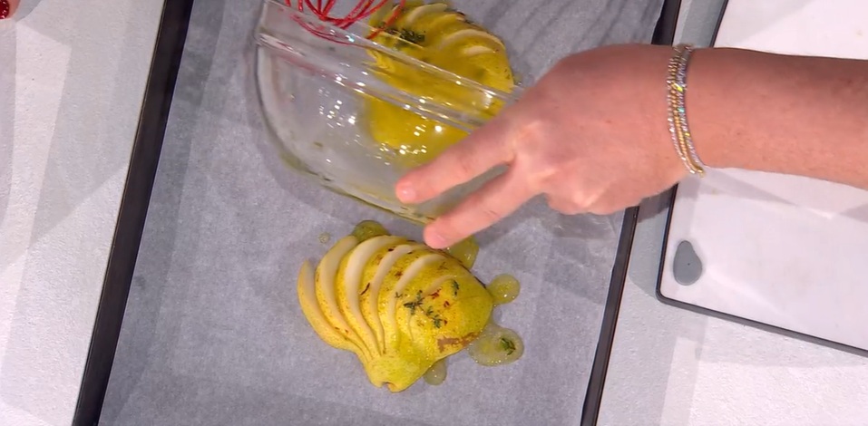 In una ciotola, mescoliamo il miele con il succo di limone, l’olio evo e del timo sfogliato.
