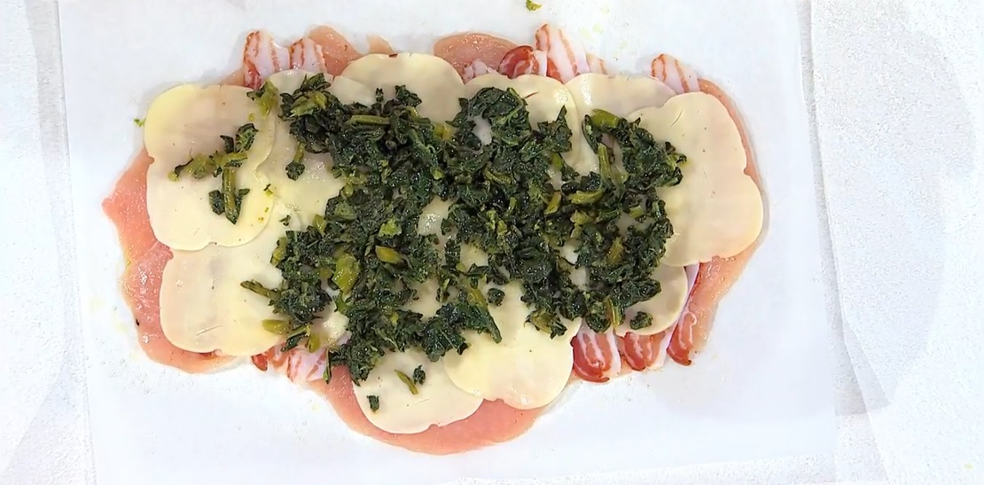 Strofiniamo la carne con uno spicchio d’aglio e disponiamo sopra la pancetta affettata, la scamorza a fettine e, infine, i friarielli ripassati in padella e tritati al coltello. Arrotoliamo la carne di pollo sul ripieno, a formare un rotolo stretto. A questo punto, possiamo chiudere la carta forno a caramella e cuocerlo al vapore, oppure possiamo legarlo con lo spago (senza carta forno), metterlo in una pirofila con un mazzetto di erbe, brodo, sale, pepe, un filo d’olio e cuocerlo in forno caldo e statico a 140° per 40 minuti.